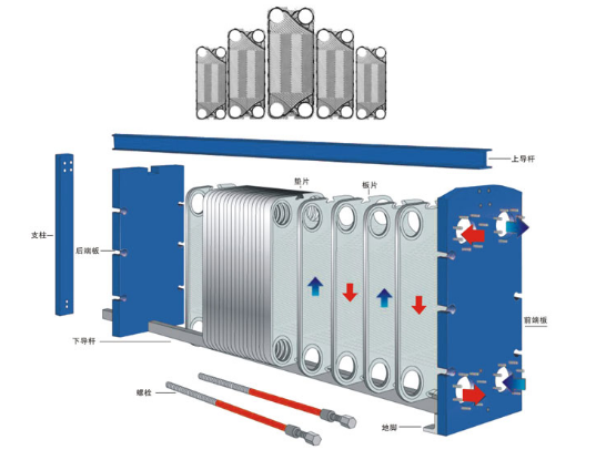 板式换热器由一组金属板片组成,板上有四个角孔,供冷热两种介质通过。组装时A板和B板交替排列,板片间形成网状通道,密封垫把冷热介质密封在换热器里,同时又合理的将冷热介质分开而不致混合。在通道里面冷热流体间隔流动,可以根据需要逆流或顺流,在流动过程中冷热流体通过板壁进行热交换,从而达到所需的效果。